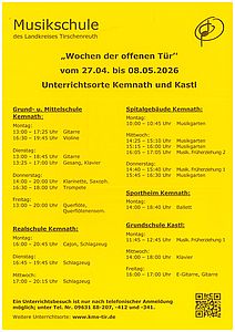 Im Zeitraum vom 27. April bis 08. Mai 2026 veranstaltet die Kreismusikschule des Landkreises Tirschenreuth die „Wochen der offenen Tür“. Interessierte…