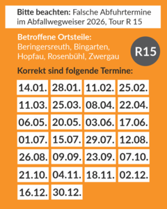 Im Abfallwegweiser 2026 des Landkreises Tirschenreuth sind bei der Tour R 15 falsche Entsorgungstermine…