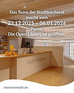 Das Team der Stadtbücherei macht vom 22.12.2025 bis einschließlich 06.01.2026 Pause. Die Open Library ist während der Schließtage täglich von 09:00…