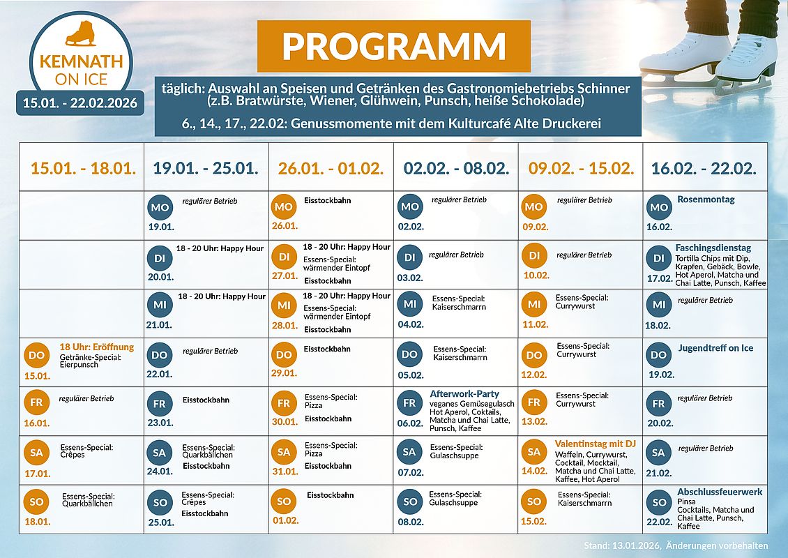 Begleitet wird der Eislaufbetrieb von einem abwechslungsreichen Rahmenprogramm sowie wechselnden kulinarischen Angeboten. Zu den Höhepunkten zählen unter anderem eine Afterwork-Party am 6. Februar, der Valentinstag on Ice mit DJ am 14. Februar, Faschingsdienstag sowie ein stimmungsvolles Abschlussfeuerwerk am letzten Betriebstag.