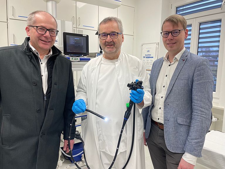Die Krankenhausstiftung Kemnath, deren Kuratorium Bürgermeister Roman Schäffler leitet und dem Dr. Jilge als Mitglied angehört, übergab nun im Krankenhaus ein neues Koloskop der „absoluten Upper Class“, wie Dr. Jilge schwärmt. Es ermöglicht sehr exakte Diagnostik und ausgezeichnete Bildgebung. Das Gerät hat einen Wert von rund 45.000 Euro. Über diese großzügige Geste der Krankenhausstiftung freut sich auch Klinikdirektor Stephan Schumacher. Er bedankte sich für die Zuwendung im Sinne von sicherer und präziser Patientenbehandlung. Bürgermeister Schäffler und Direktor Schumacher sehen darin zugleich eine Stärkung des Medizinstandorts Kemnath.
