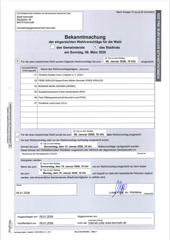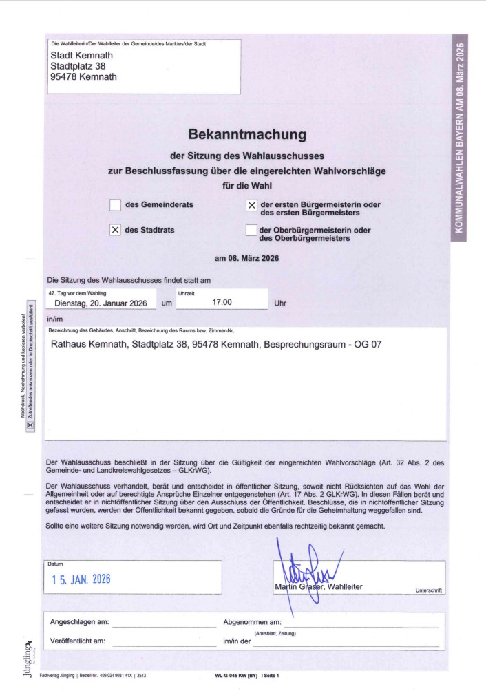 Für die am 8. März 2026 stattfindende Kommunalwahl und der möglichen Stichwahl am 22. März 2026 ist ein Gemeindewahlleiter zu bestellen. Bei der letzten Kommunalwahl im Jahr 2020 war Herr Graser der Gemeindewahlleiter für die Stadt Kemnath. Für die Kommunalwahl am 08.03.2026 und die mögliche Stichwahl am 22.03.2026 wurde der Wahlsachbearbeiter der VG Kemnath, Martin Graser, mit Beschluss des Stadtrates vom 06.10.2025 zum Gemeindewahlleiter der Stadt Kemnath bestellt. Herr Lukas Kopp, Mitarbeiter des Wahlamtes in der Verwaltungsgemeinschaft Kemnath wurde zum stellvertretenden Gemeindewahlleiter berufen.