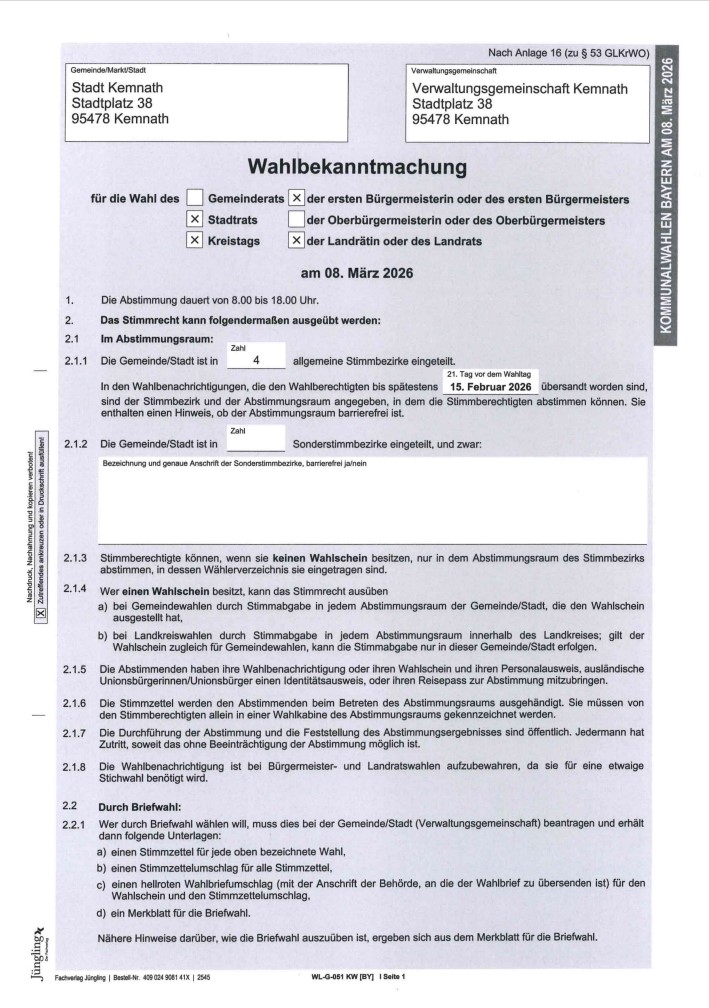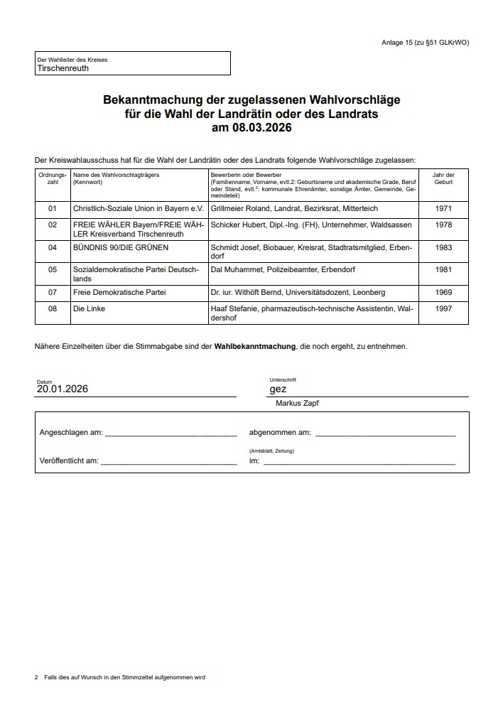 Bekanntmachung der zugelassenen Wahlvorschläge für die Wahl des Kreistags am 8. März 2026 und Anlage zur Bekanntmachung der zugelassenen Wahlvorschläge für die Wahl des Kreistags am 8. März 2026